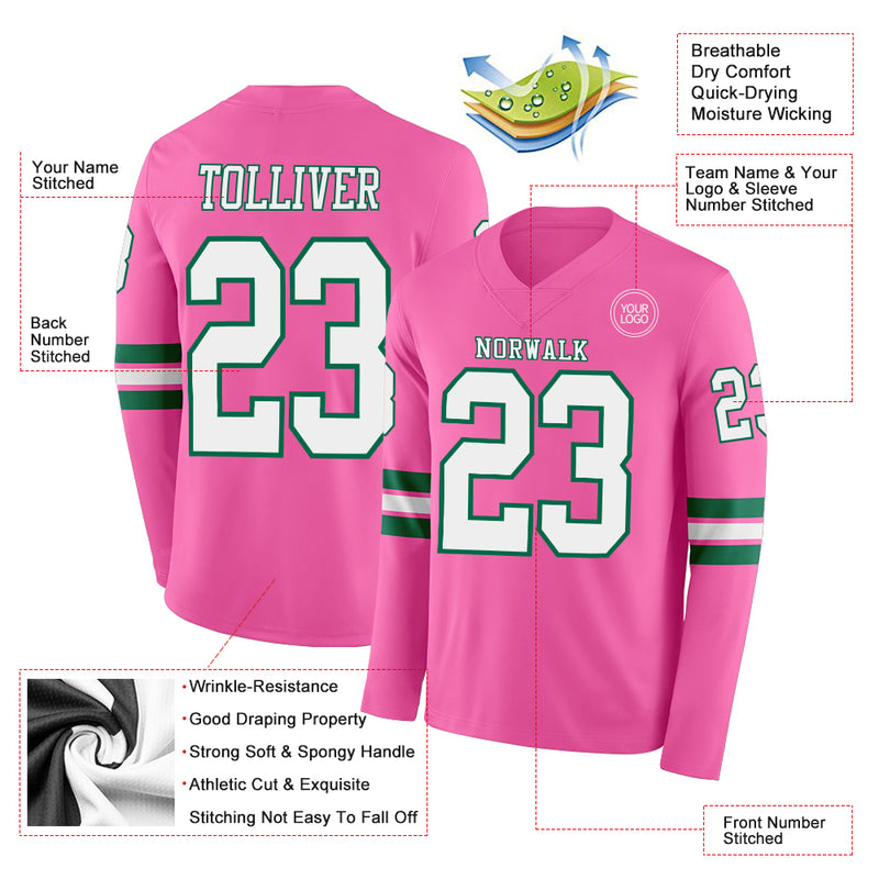 Custom Pink White=Kelly Green Long Sleeve Authentic Football Jersey
