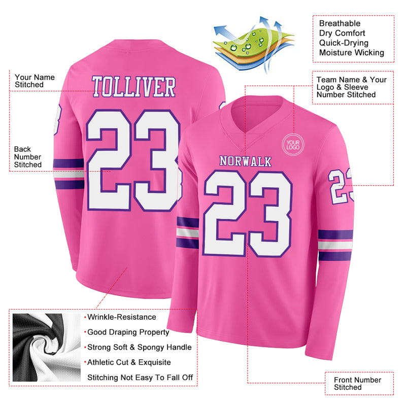 Custom Pink White-Purple Long Sleeve Authentic Football Jersey