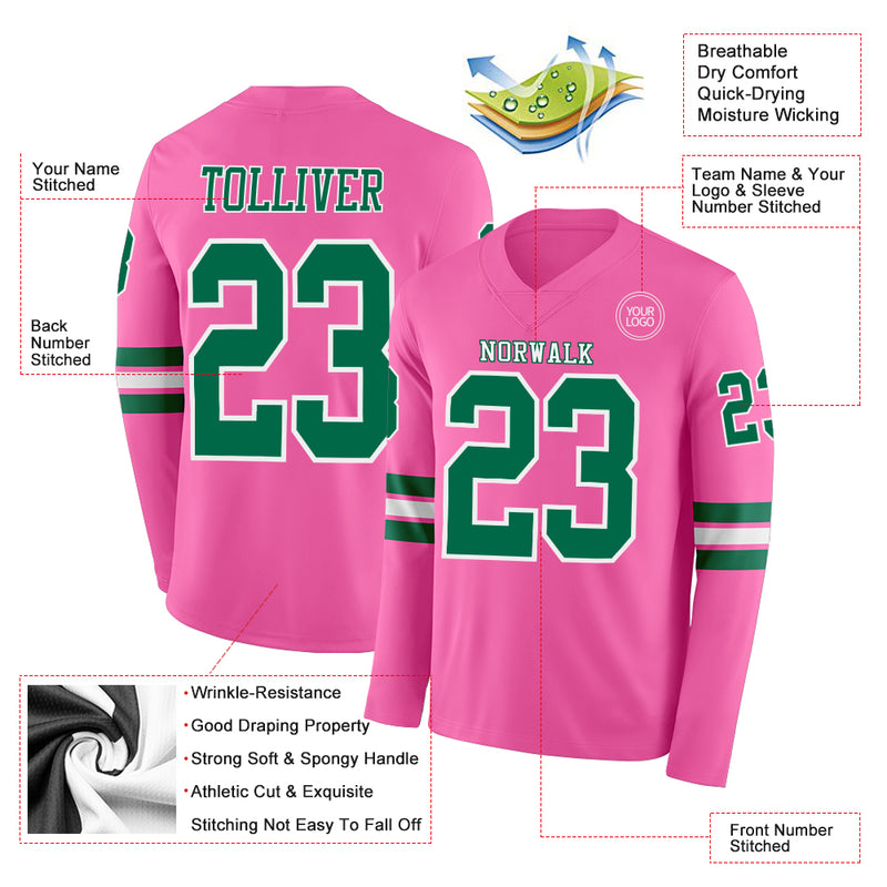 Custom Pink Kelly Green-White Long Sleeve Authentic Football Jersey