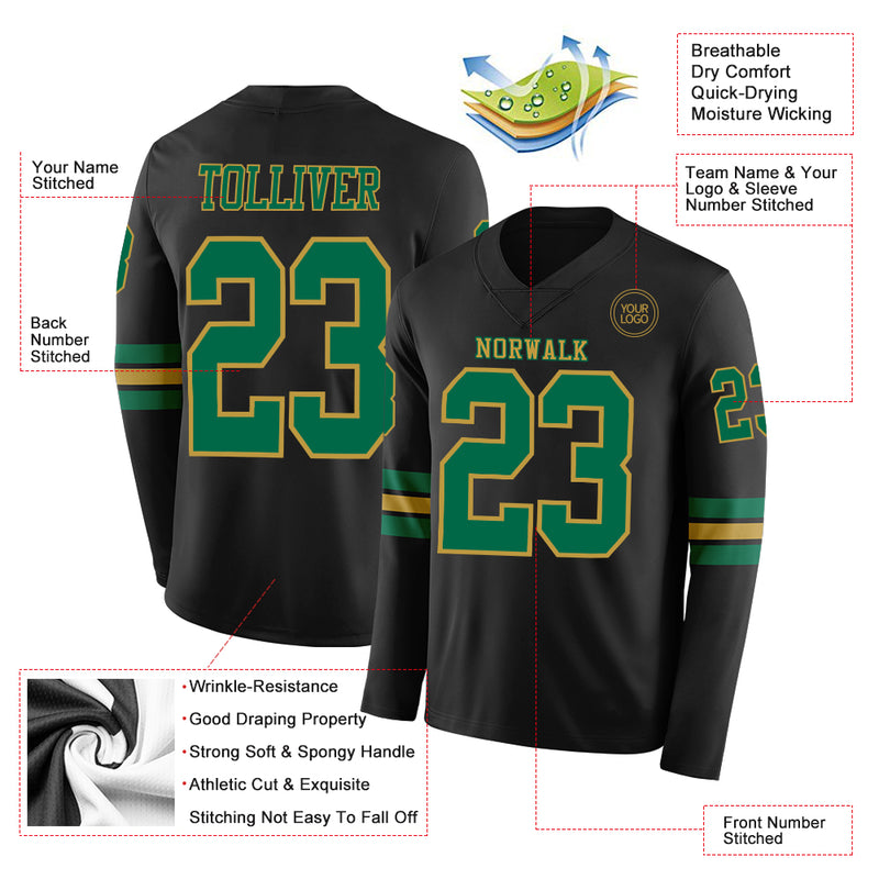 Custom Black Kelly Green-Old Gold Long Sleeve Authentic Football Jersey