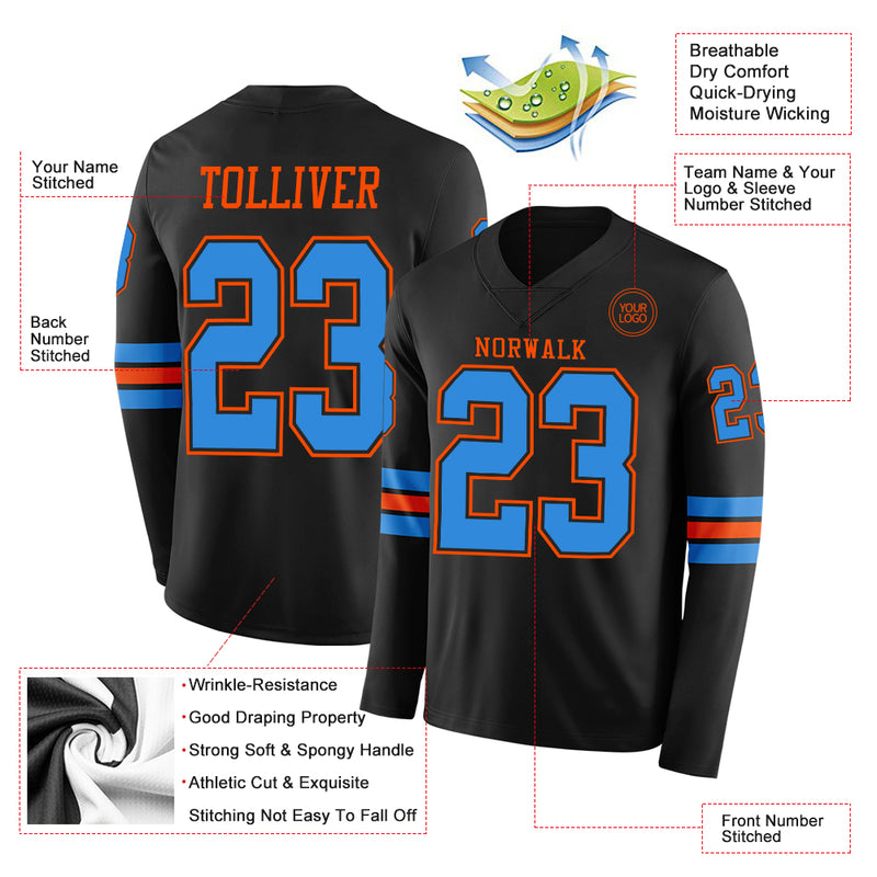 Custom Black Powder Blue-Orange Long Sleeve Authentic Football Jersey