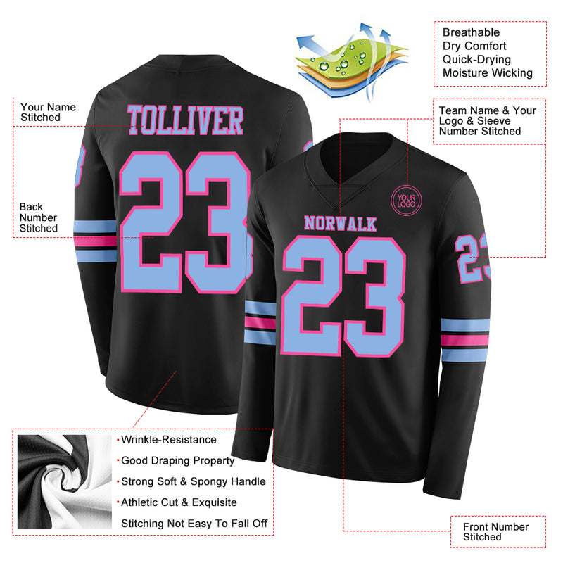 Custom Black Light Blue-Pink Long Sleeve Authentic Football Jersey
