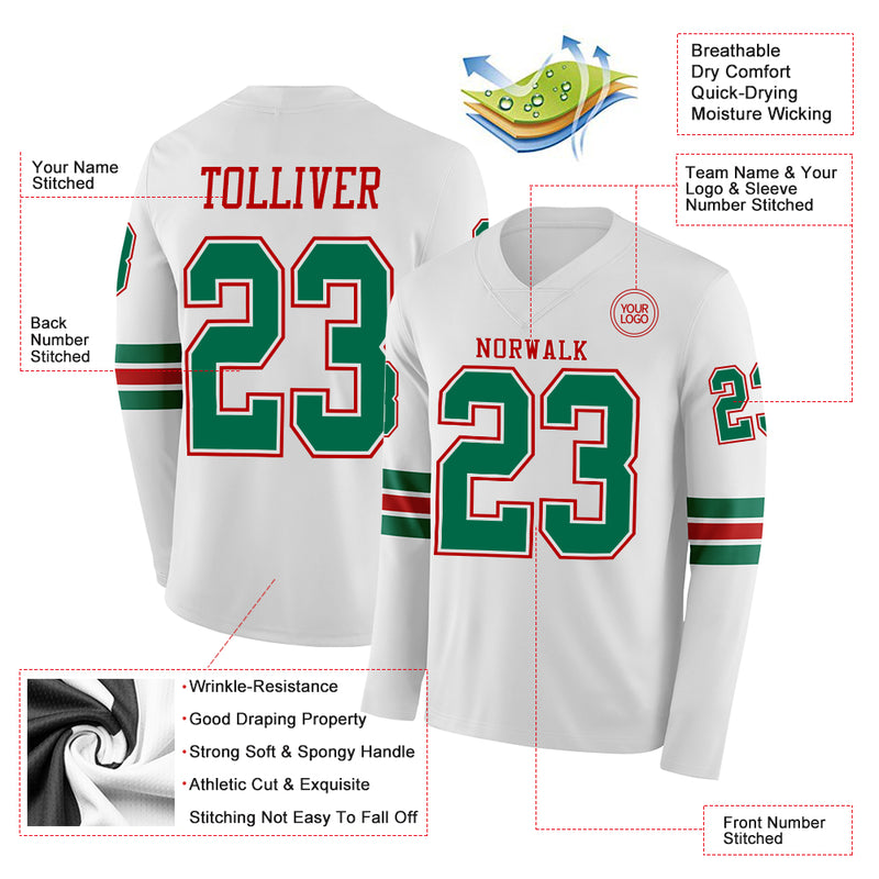Custom White Kelly Green-Red Long Sleeve Authentic Football Jersey