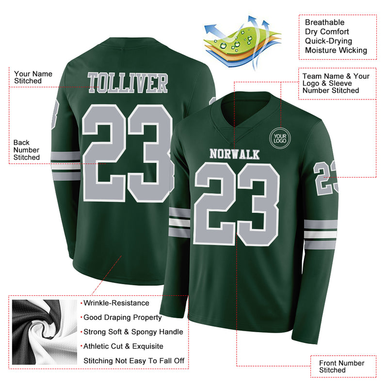 Custom Green Gray-White Long Sleeve Authentic Football Jersey