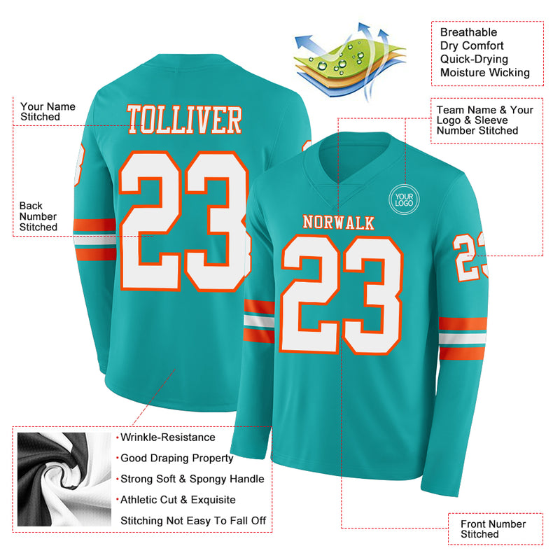 Custom Aqua White-Orange Long Sleeve Authentic Football Jersey