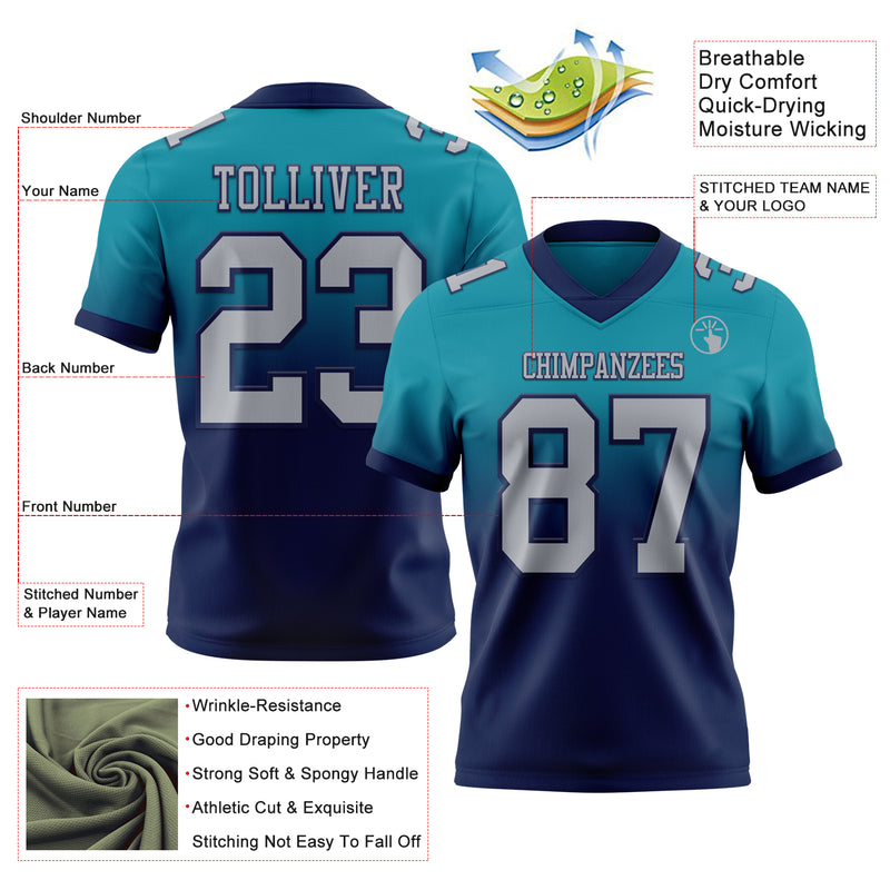 Custom Teal Gray-Navy Authentic Fade Fashion Football Jersey
