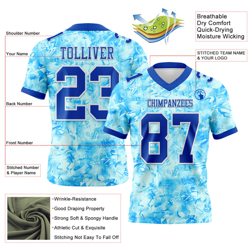 Custom Graffiti Pattern Thunder Blue-White 3D Pattern Scratch Authentic Football Jersey