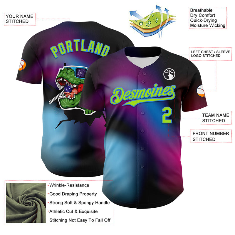 Custom Black Neon Green-Electric Blue 3D Pattern Design Rave Psychedelic Neon Dinosaur Authentic Baseball Jersey