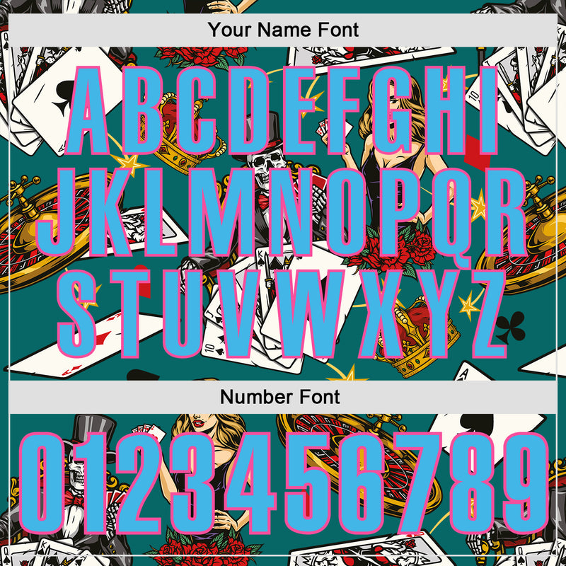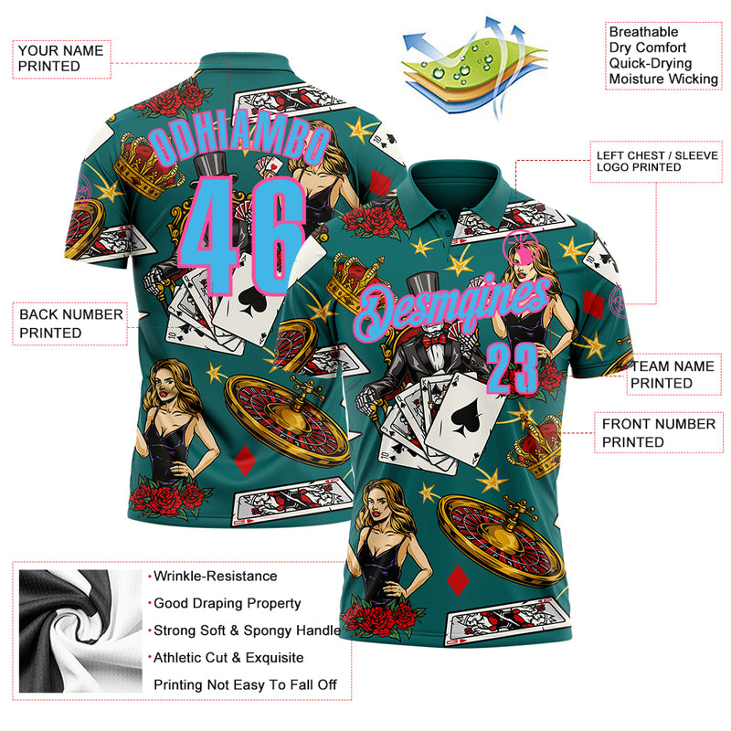 Custom Teal Sky Blue-Pink 3D Gambling Poker Performance Polo Shirt