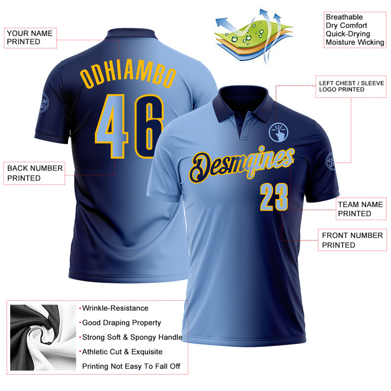Custom Navy Light Blue-Gold 3D Gradient Fashion Performance Polo Shirt