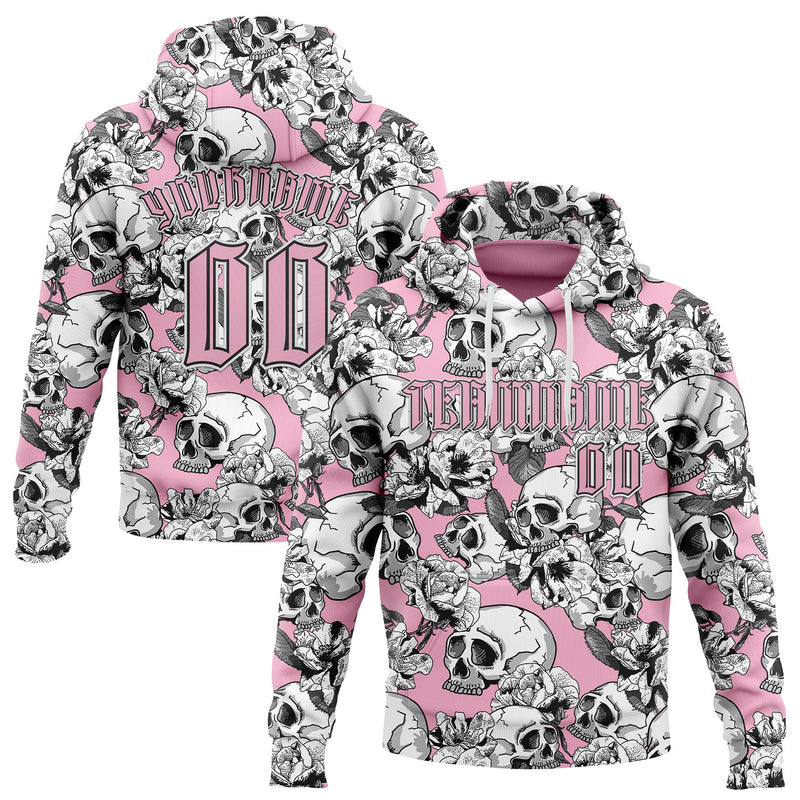 Custom Light Pink Black-White 3D Skull Roses Gothic Sports Pullover Sweatshirt Hoodie