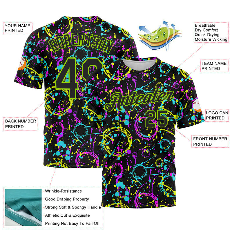 Custom Graffiti Pattern Black-Neon Green 3D Neon Splatter Performance T-Shirt