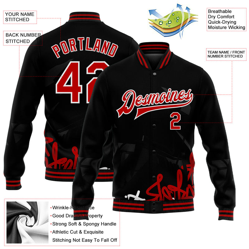 Custom Graffiti Pattern Red-Black Dark Abstract Urban Street Art 3D Bomber Full-Snap Varsity Letterman Jacket