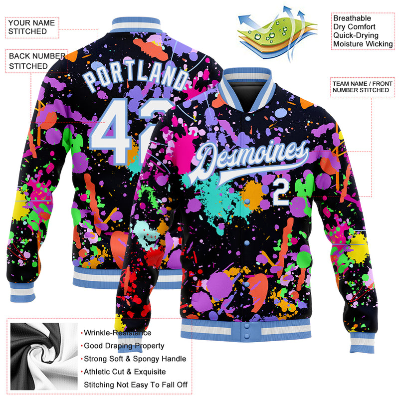 Custom Graffiti Pattern White-Light Blue Splashes 3D Bomber Full-Snap Varsity Letterman Jacket