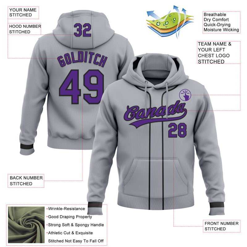 Custom Stitched Gray Purple-Black Baseball Pullover Sweatshirt Hoodie