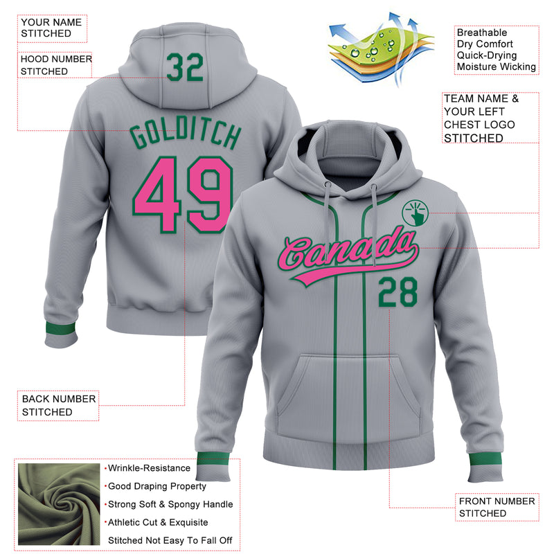 Custom Stitched Gray Pink-Kelly Green Baseball Pullover Sweatshirt Hoodie