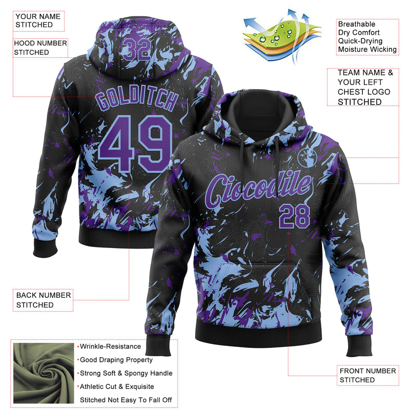 Custom Stitched Black Purple-Light Blue Splash Sports Pullover Sweatshirt Hoodie