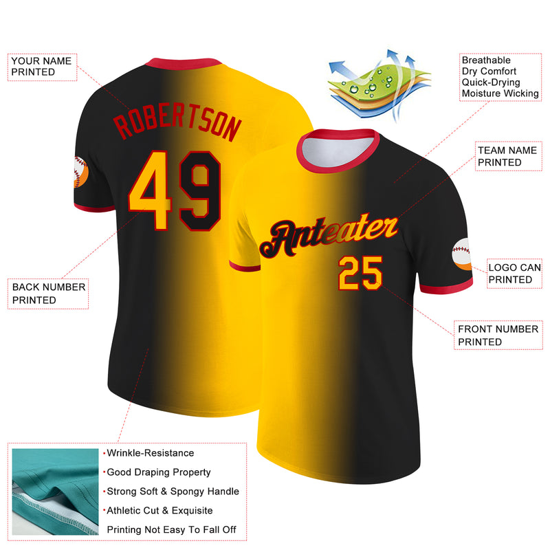 Custom Black Gold-Red Gradient Fashion Performance T-Shirt