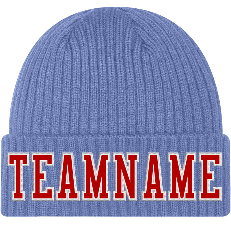 Custom Light Blue Red-White Stitched Cuffed Knit Hat