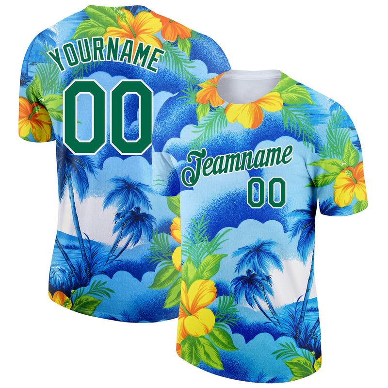 Custom White Kelly Green 3D Pattern Design Beach Hawaii Palm Trees And Flowers Performance T-Shirt