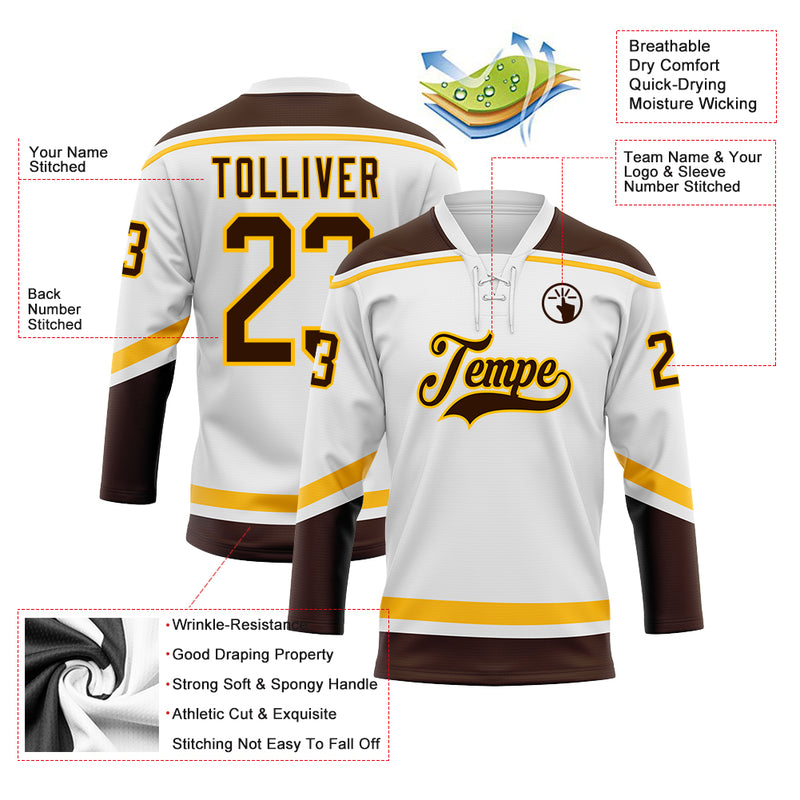 Custom White Brown-Gold Hockey Lace Neck Jersey