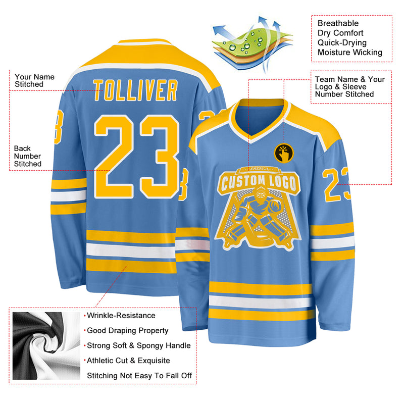 Custom Light Blue Gold-White Hockey Jersey