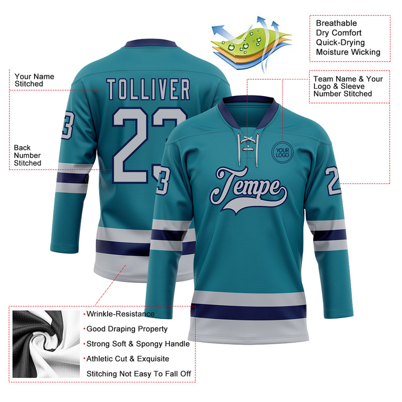 Custom Teal Gray-Navy Hockey Lace Neck Jersey