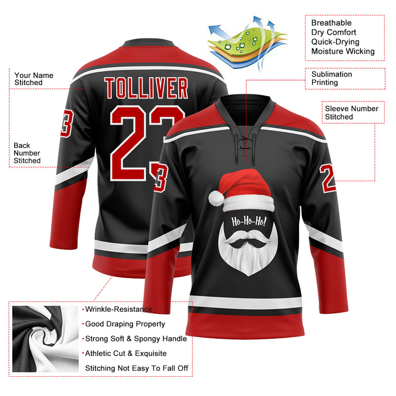 Custom Black Red-White Christmas Santa Claus 3D Hockey Lace Neck Jersey