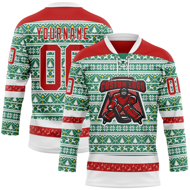 Custom Kelly Green Red-White 3D Christmas Ugly Sweater Hockey Lace Neck Jersey