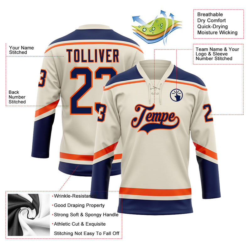 Custom Cream Navy-Orange Hockey Lace Neck Jersey