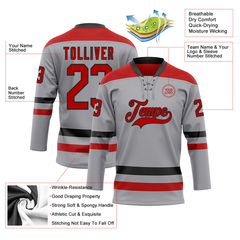 Custom Gray Red-Black Hockey Lace Neck Jersey