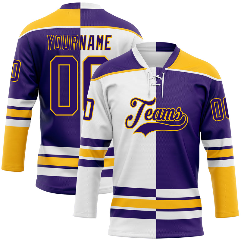Custom Purple Gold-White Split Fashion Hockey Lace Neck Jersey