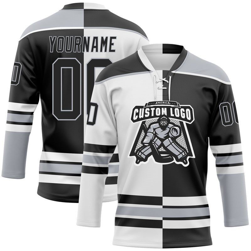 Custom Black Gray-White Split Fashion Hockey Lace Neck Jersey