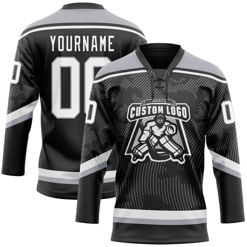 Custom Black White-Gray 3D Pattern Curve Lines Hockey Lace Neck Jersey