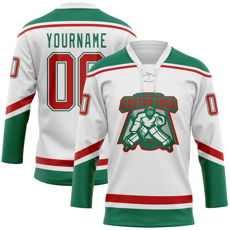 Custom White Red-Kelly Green Hockey Lace Neck Jersey