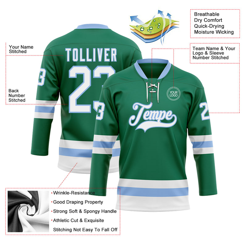 Custom Kelly Green White-Light Blue Hockey Lace Neck Jersey