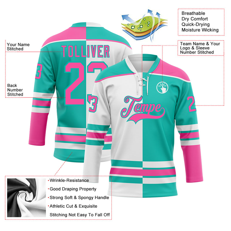 Custom Aqua Pink-White Split Fashion Hockey Lace Neck Jersey