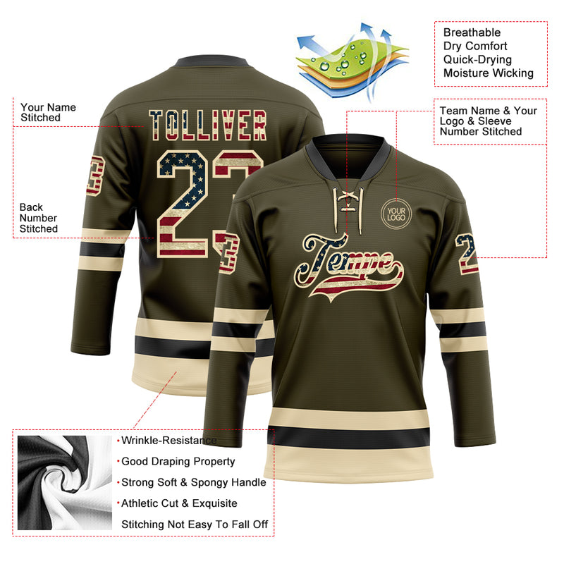 Custom Olive Vintage USA Flag Cream-Black Salute To Service Hockey Lace Neck Jersey