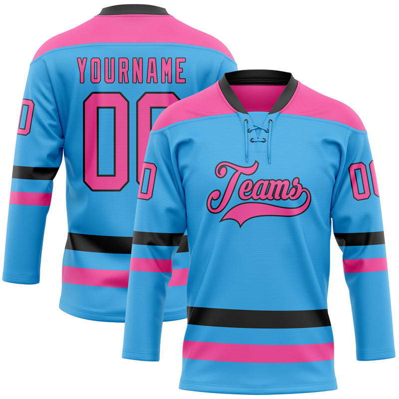 Custom Sky Blue Pink-Black Hockey Lace Neck Jersey