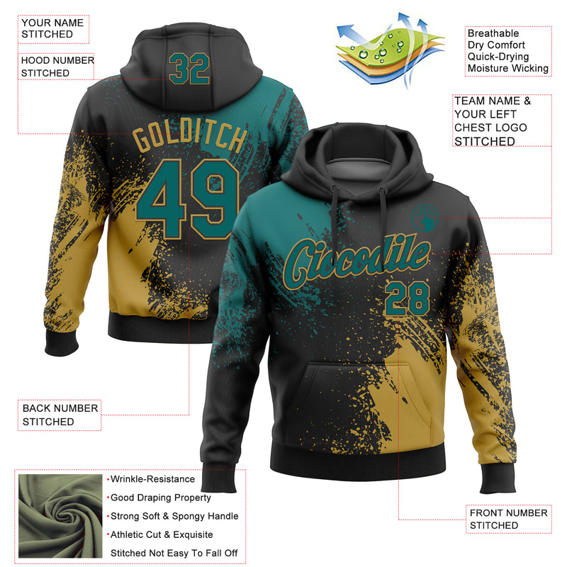 Custom Stitched Black Teal-Old Gold 3D Pattern Design Abstract Brush Stroke Sports Pullover Sweatshirt Hoodie