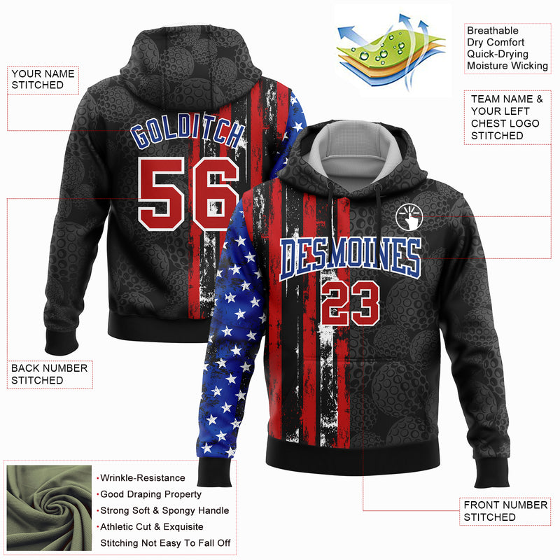 Custom Stitched Black Red-Royal 3D Golf Ball American Flag Sports Pullover Sweatshirt Hoodie
