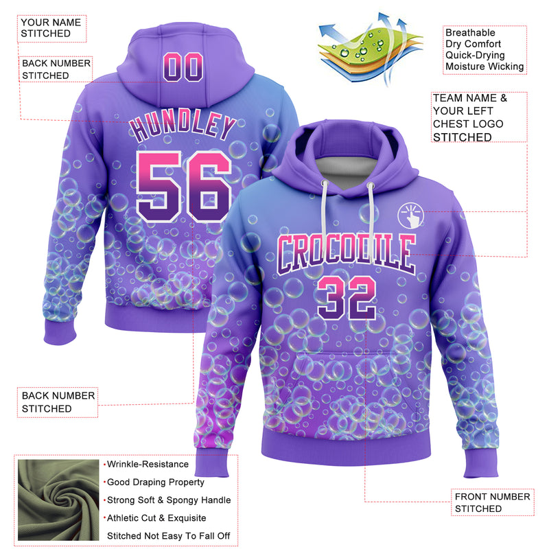 Custom Stitched Purple Pink-White Fade 3D Pattern Design Colorful Bubbles Sports Pullover Sweatshirt Hoodie