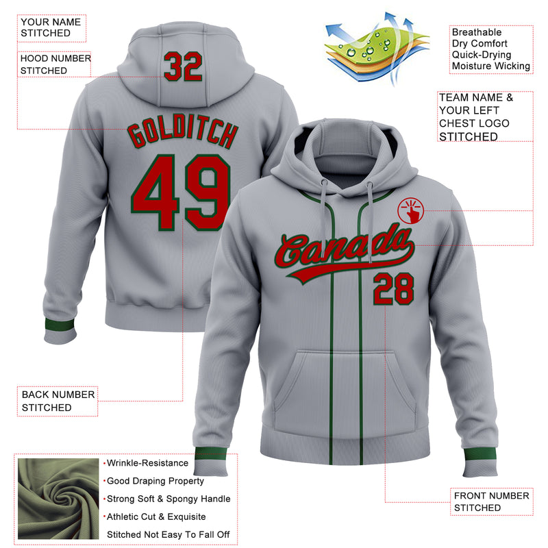 Custom Stitched Gray Red-Green Baseball Pullover Sweatshirt Hoodie