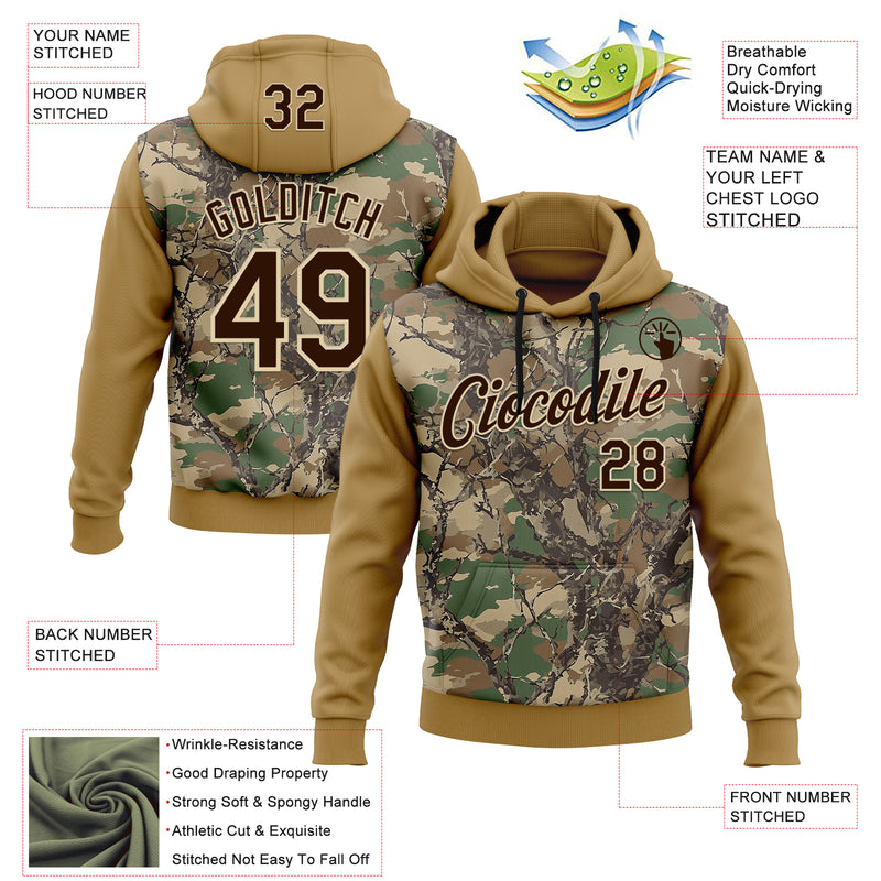 Custom Stitched Old Gold Brown-Cream 3D Pattern Design Tree Camo Hunting Sports Pullover Sweatshirt Hoodie