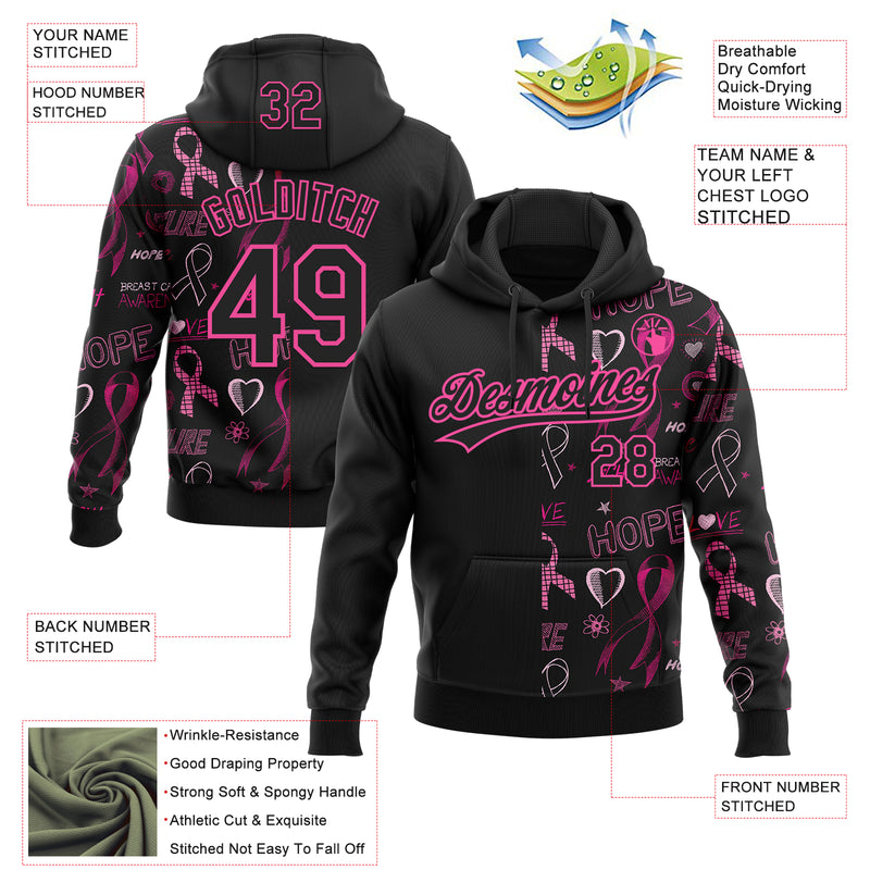 Custom Stitched Black Pink 3D Pattern Design Pink Ribbon Breast Cancer Awareness Month Women Health Care Support Sports Pullover Sweatshirt Hoodie