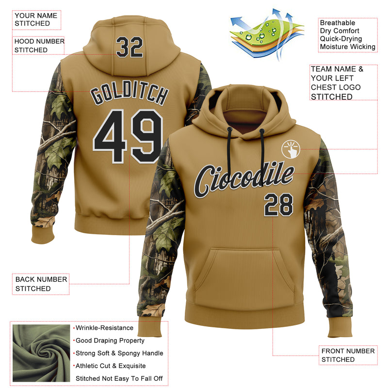 Custom Stitched Old Gold Black-White 3D Pattern Design Tree Camo Hunting Sports Pullover Sweatshirt Hoodie