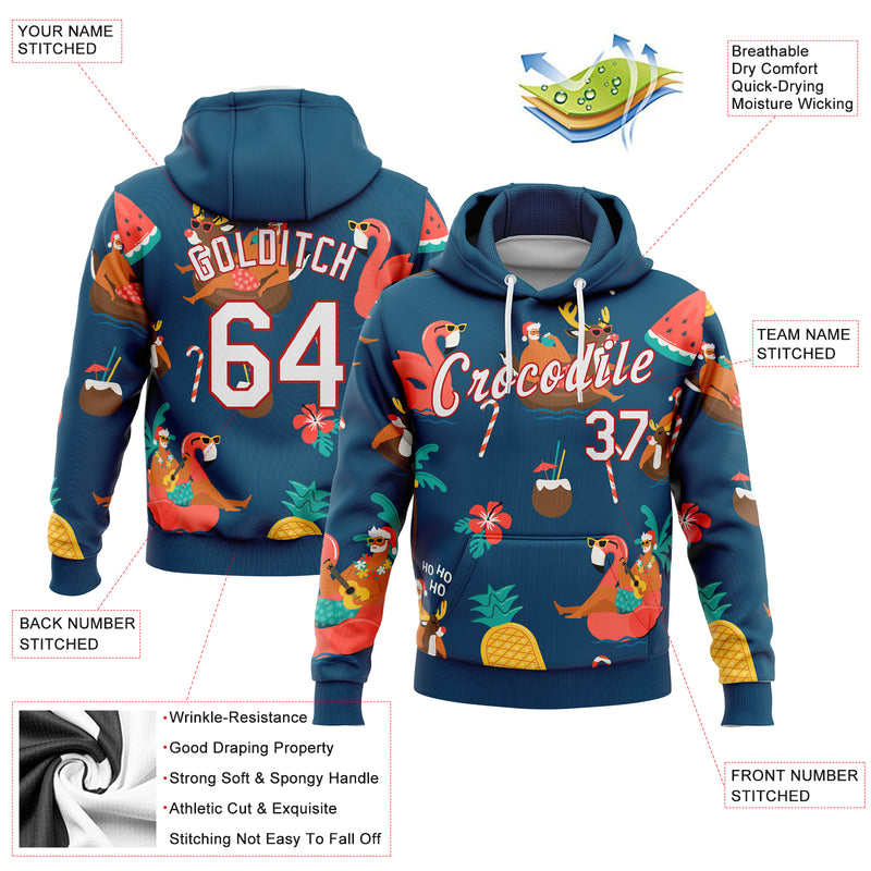 Custom Stitched Navy White-Red 3D Tropical Christmas Santas With Reindeers And Flamingos Sports Pullover Sweatshirt Hoodie