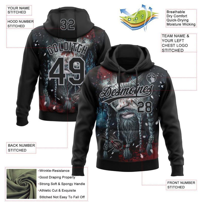 Custom Stitched Black Gray Viking Pattern Pullover Sweatshirt Hoodie