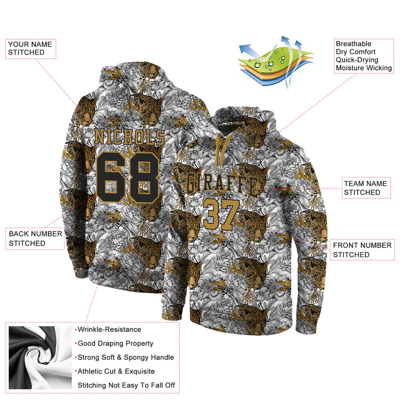 Custom Stitched Black Black-Old Gold 3D Pattern Design Leopard Sports Pullover Sweatshirt Hoodie