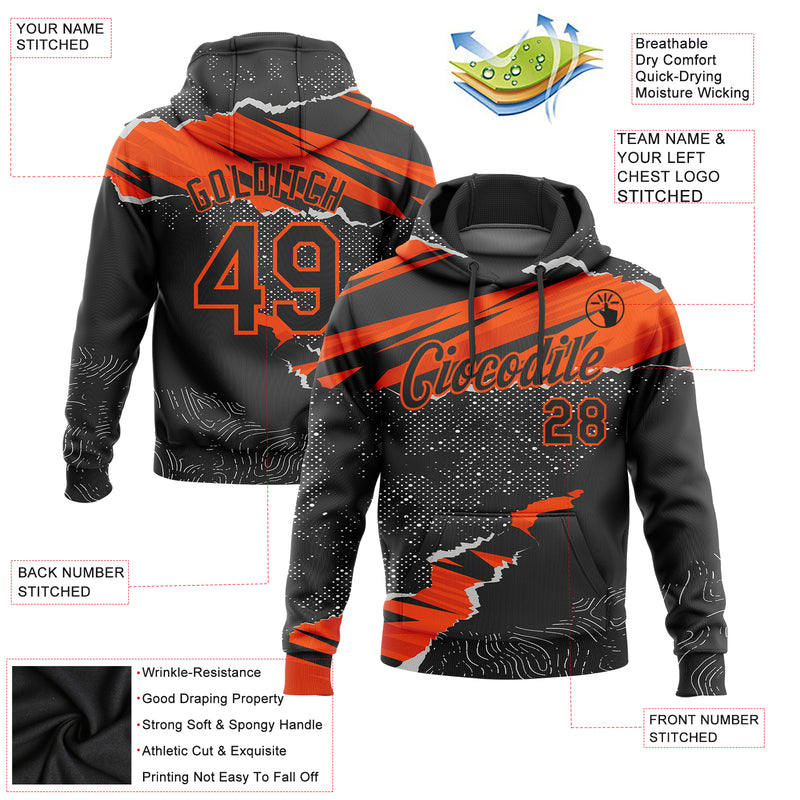 Custom Stitched Black Orange 3D Pattern Design Torn Paper Style Sports Pullover Sweatshirt Hoodie